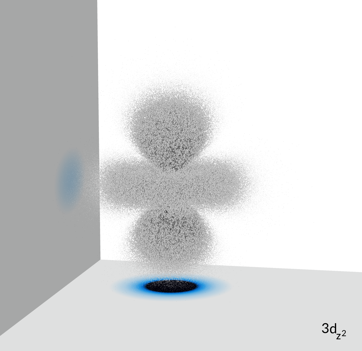 Wave functions (probability functions for the position) with definite values of the quantum numbers n, l, and m for single electrons are called orbitals. Linear combinations (superpositions) of wave functions are also solutions to the Schrödinger equation for the hydrogen atom. The orbitals with the quantum number l = 0, referred to as s orbitals, are always spherically symmetric. Orbitals with l = 1 are denoted p orbitals and show a clear angular dependency. Orbitals with l = 2 are called d orbitals, which show an even more complicated angular dependency. The plots show the probability density visualized by particles, where higher density and darker color indicates a higher probability density.