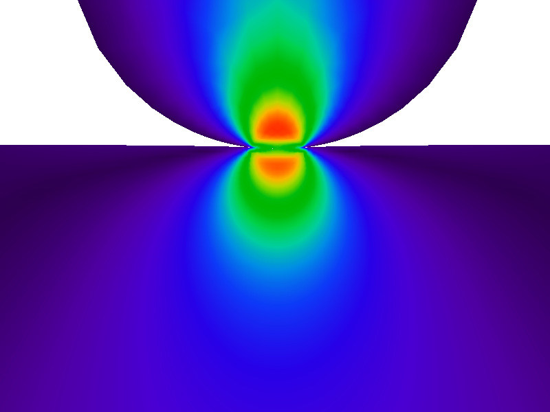 Example of a model used for analyzing contact problems. Equivalent stress at the contact between a cylinder and an elastic half plane. Equivalent stress at the contact between a cylinder and an elastic half plane.
