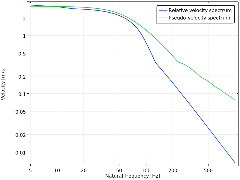 Next, the relative velocity spectrum and the pseudovelocity spectrum are compared. As can be seen, they are quite different. The pseudovelocity and pseudoacceleration spectra do not represent the true relative spectra. This is a general observation, and the pseudo spectra should be viewed as different representations of the displacement spectrum.