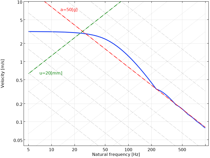 Tripartite plot of the response spectrum for the half sine pulse. The 50-g acceleration level and 20-mm displacement level are highlighted in red and green, respectively. The diagonal displacement (dotted) and acceleration (dashed) levels have the same '1-2-5-10' spacing as used for the velocity axis.