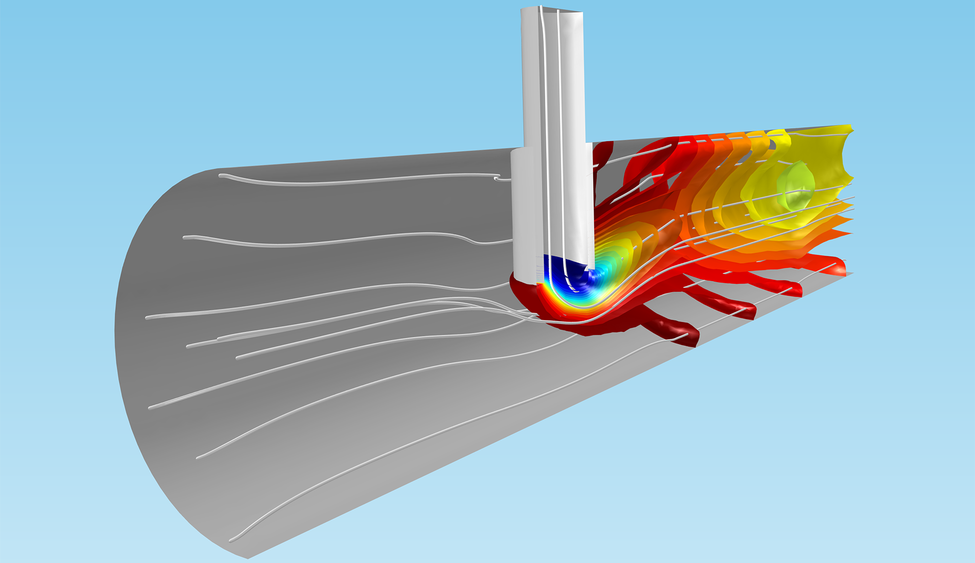 Transport and reactions in a reactor. The concentration isosurfaces reveal mass transfer through diffusion and convection. The flux through diffusion takes place perpendicular to the concentration isosurfaces, i.e., the reactions may cause a flux to the reaction site of the species that are consumed in the reaction. Convection creates a larger separation between the concentration isosurfaces and takes place along the streamlines of the fluid flow (in white), which in some places run along the isosurfaces, since convection tends to eliminate concentration gradients along its main direction.