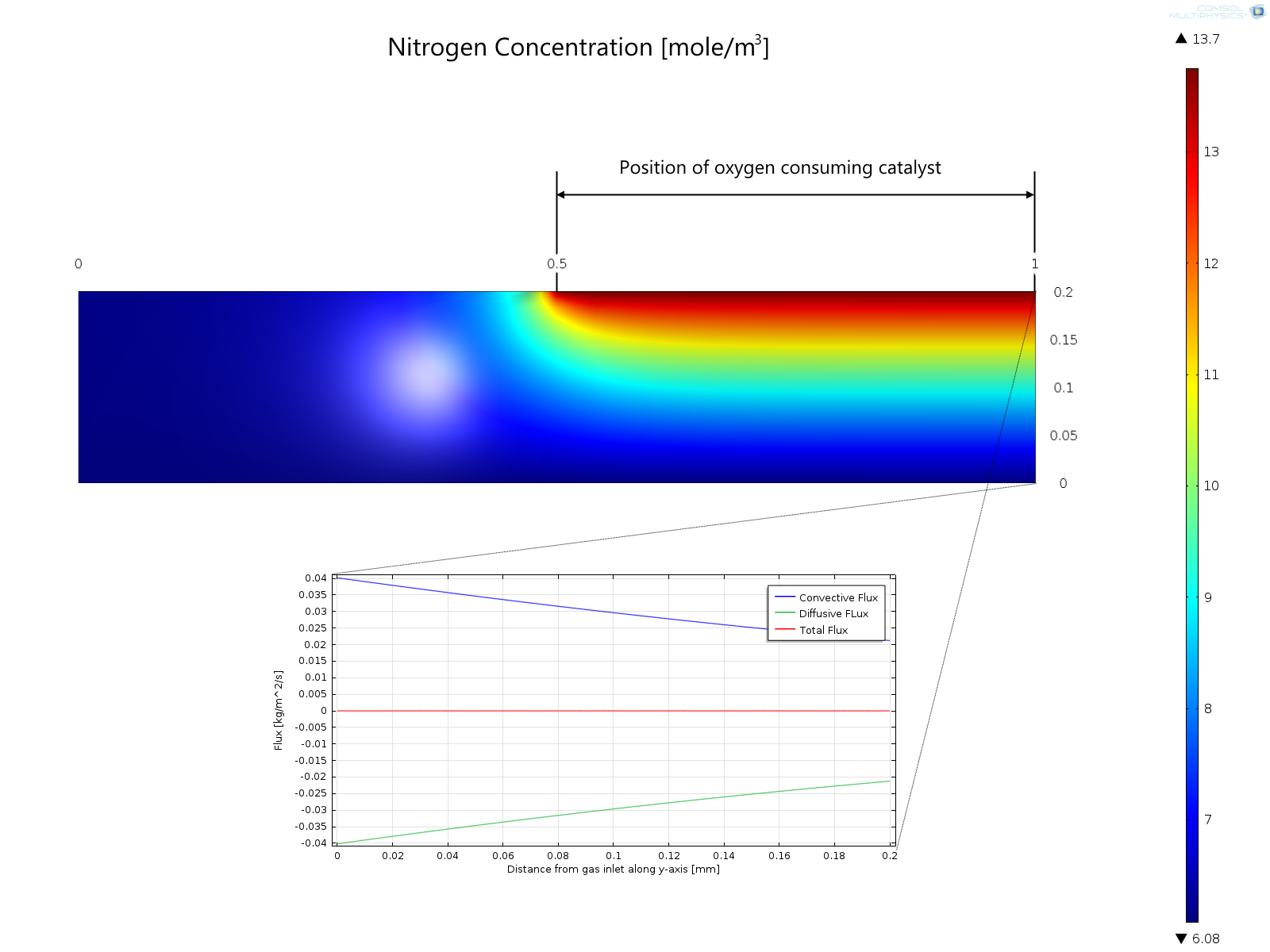 Surface plot of the nitrogen concentration in a gas diffusion electrode. The flux along the right vertical edge, plotted in the x-y plot, shows that the diffusive flux from the catalytic surface exactly compensates the convective flux to this surface, generated by oxygen consumption at the catalyst's surface.