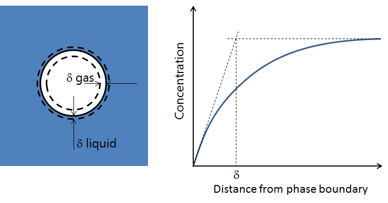 Due to the difficulties of numerically resolving steep gradients in potential, mass transfer across phase boundaries is often expressed using difference equations, instead of differential equations. This approximation implies that the gradients, included in the driving forces, are linearized inside a fictitious boundary layer (see the figure below). The thickness of the layer is then defined as the distance from a phase boundary where the linearized concentration gradient, starting from the concentration at the phase boundary, reaches the bulk concentration. The definition of the boundary layer also means that its thickness may be different for different species.